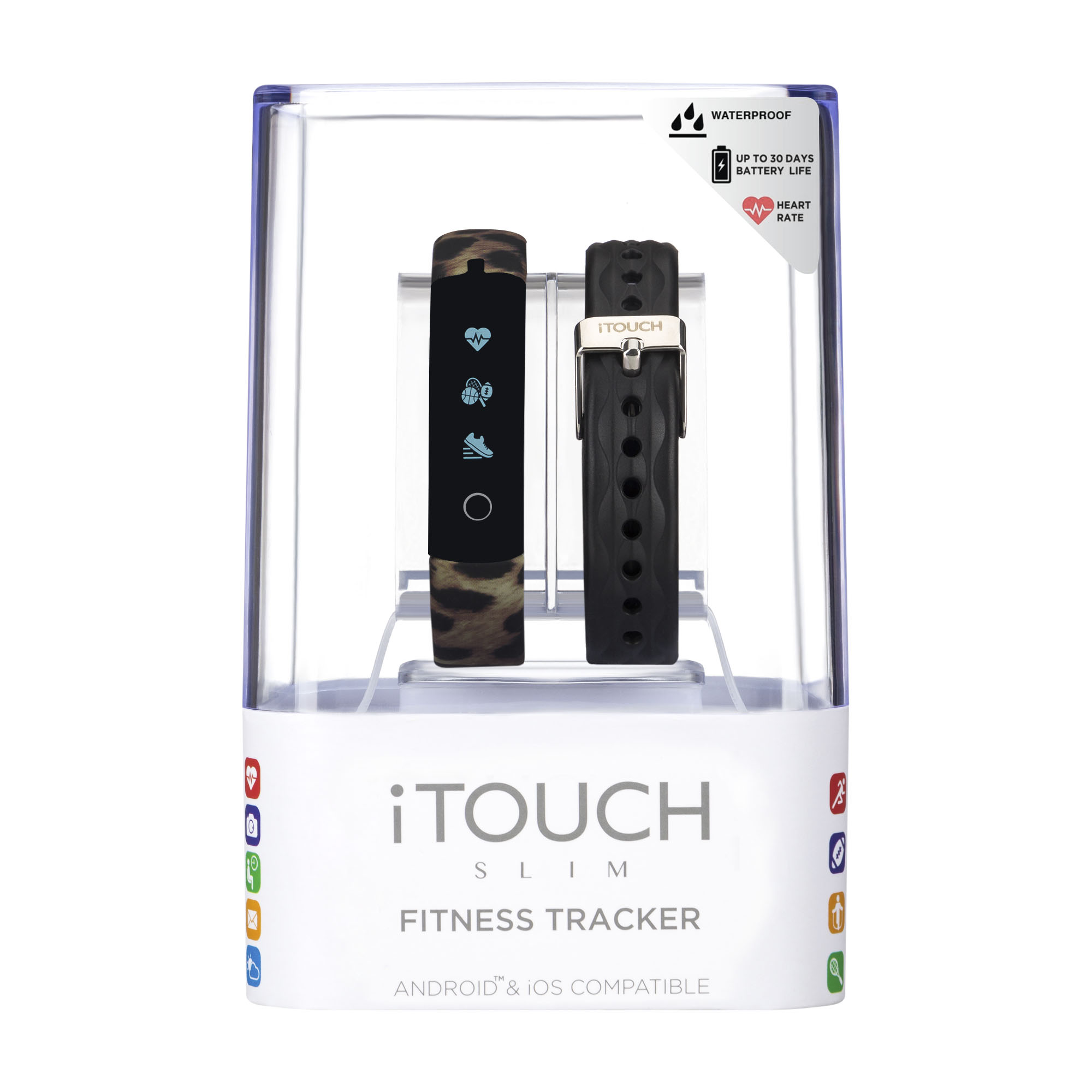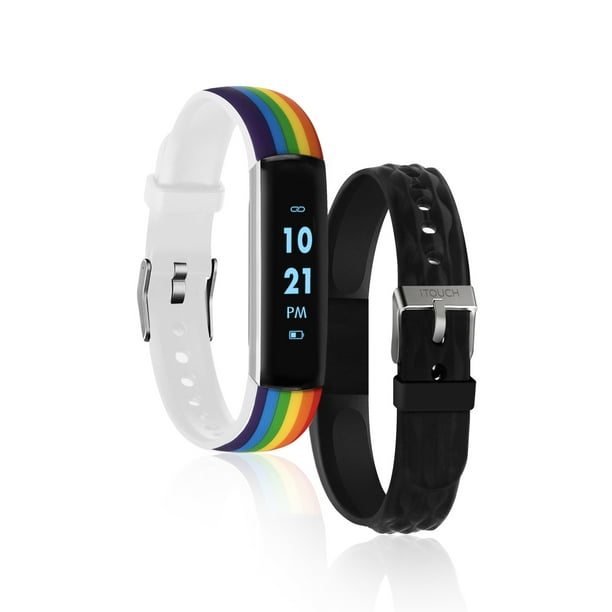 Itouch Itouch Slim Interchangeable Fitness Tracker With Bonus Strap Rainbow Print On White Band Black Band Walmart Com Walmart Com